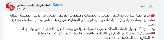 دعت حملة ضد تجريم العمل المدني و عدد من الجمعيات ومنظمات المجتمع المدني في تونس، إلى المشاركة في وقفة تضامن ودعم لسعدية مصباح