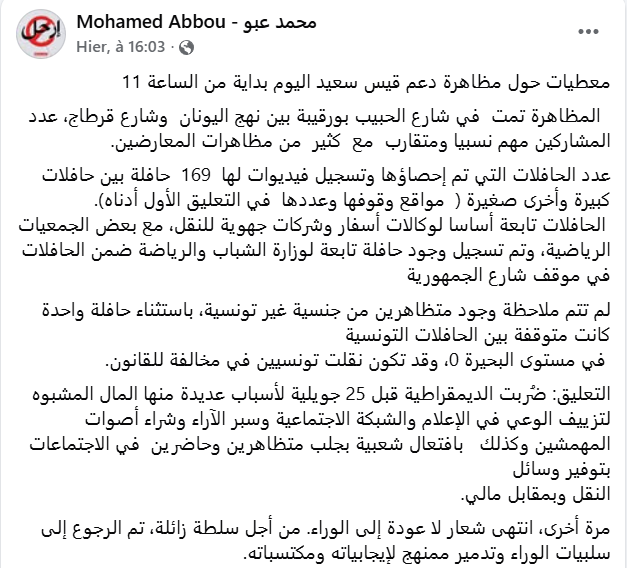 كما أشار عبو الى أنه “لم تتم ملاحظة وجود متظاهرين من جنسية غير تونسية، باستثناء حافلة واحدة كانت متوقفة بين الحافلات التونسية في مستوى البحيرة 0، وقد تكون نقلت تونسيين في مخالفة للقانون”، وفق قوله.