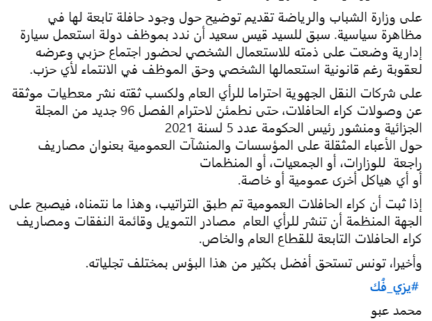 ودعا عبو في هذا الإطار، وزارة الشباب والرياضة إلى تقديم توضيح حول وجود حافلة تابعة لها في مظاهرة سياسية، مطالبا كذلك شركات النقل الجهوية لنشر معطيات موثقة عن وصولات كراء الحافلات، احتراما للفصل 96 جديد من المجلة الجزائية و منشور رئيس الحكومة عدد 5 لسنة 2021 حول الأعباء المثقلة على المؤسسات والمنشآت العمومية بعنوان مصاريف راجعة للوزارات، أو الجمعيات، أو المنظمات أو أي هياكل أخرى عمومية أو خاصة، وفق تعبيره.