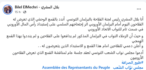 ندد بلال المشري رئيس لجنة الفلاحة بالبرلمان التونسي بما وصفه بالقمع الوحشي الذي تعرض له الفلاحون أمام البرلمان الأوروبي اثر إجتحاجهم السلمي على إستبداد رأس المال الأوروبي في صمت تام للنواب الاتحاد الأوروبي،وفق تعبيره.
