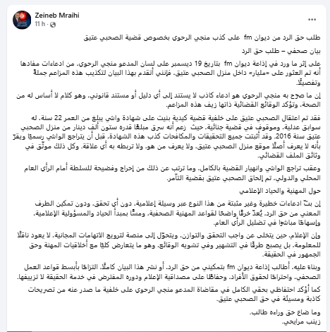 طالبت المرايحي إذعة ديوان أف أم يتمكينها من حق الرد، أو نشر بيانها كاملًا، “التزامًا بأبسط قواعد العمل الصحفي، واحترامًا لحقوق الأفراد، وحفاظًا على مصداقية الإعلام ودوره المفترض في خدمة الحقيقة لا تزييفها”.