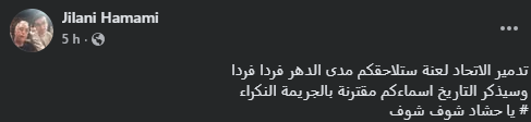 وأضاف الجيلاني الهمامي، في تدوينة على فيسبوك، “سيذكر التاريخ اسماءكم مقترنة بالجريمة النكراء”.