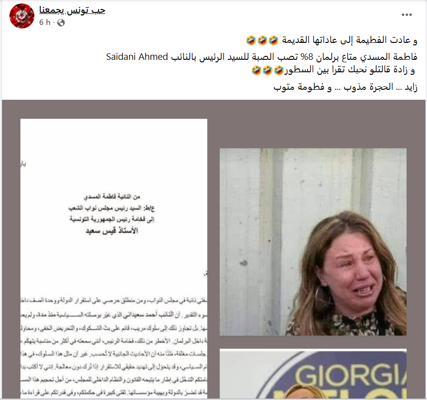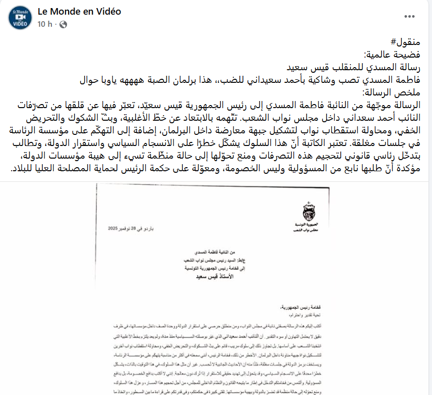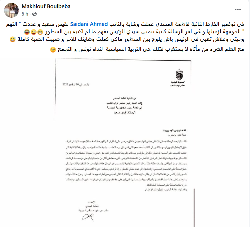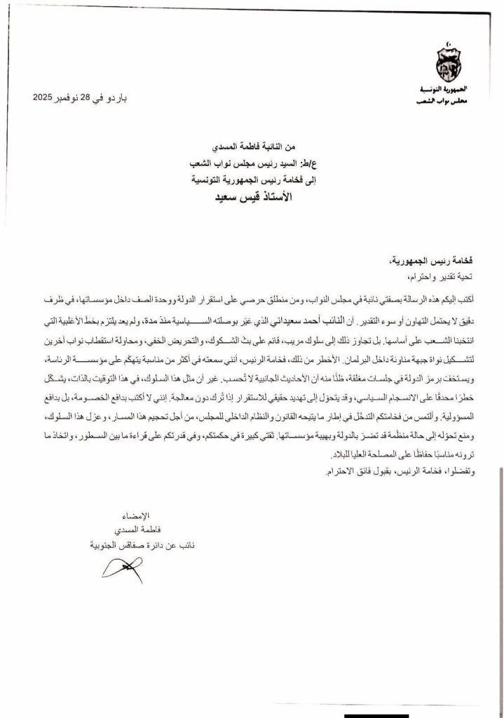 تداول عدد من رواد مواقع التواصل الاجتماعي في الساعات الأخيرة صورة لمرسالة مزعومة للنائبة بالبرلمان فاطمة المسدي بتاريخ 28 نوفمبر 2025، متوجهة بها لرئيس الجمهورية قيس سعيد في شكل "وشاية" بزميلها النائب النائب أحمد السعيداني.