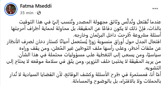 وبالتالي، وبناء على تصريحات النائبة فاطمة المسدي، فإن الوثيقة المنسوبة لها لا أساس لها من الصحة.