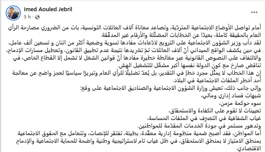 وبين أولاد جبريل في تدوينة نشرها عبر الفايسبوك، بأن “وزير الشؤون الاجتماعية قد دأب على الترويج لادّعاءات مفادها تسوية وضعية أكثر من اتنان و تسعين ألف عامل، في حين يكشف الواقع الميداني أنّ آلاف العائلات تمّ تشريدها نتيجة عدم تطبيق القانون، وتعطيل مسارات الإدماج، والالتفاف على النصوص القانونية عبر مغالطة خطيرة مفادها أنّ قوانين الشغل لا تشمل إلا القطاع الخاص”، وفق قوله.