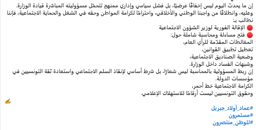 كما شدد النائب على أن “ما يحدث اليوم ليس إخفاقًا عرضيًا، بل فشل سياسي وإداري ممنهج تتحمّل مسؤوليته المباشرة قيادة الوزارة” مطالبا بالمساءلة الشاملة حول وضعية الصناديق الاجتماعية وشبهات الفساد داخل الوزارة.