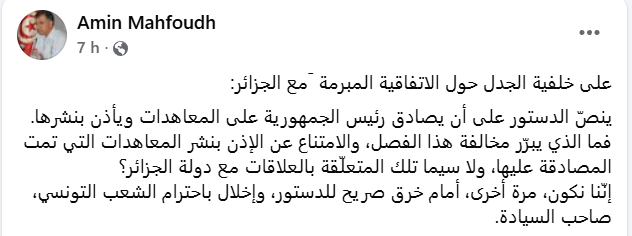وأضاف أمين محفوظ في تدوينة نشرها عبر الفايسبوك، أن الدستور ينص على أن يصادق رئيس الجمهورية على المعاهدات ويأذن بنشرها، متسائلا “ما الذي يبرّر مخالفة هذا الفصل، والامتناع عن الإذن بنشر المعاهدات التي تمت المصادقة عليها، ولا سيما تلك المتعلّقة بالعلاقات مع دولة الجزائر”.