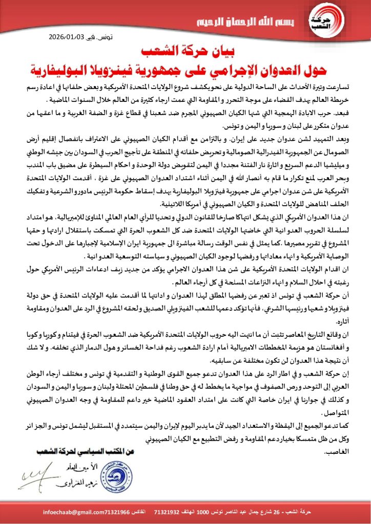 كما اعتبرت حركة الشعب، أن العدوان الأمريكي على فنزويلا يشكل انتهاكا صارخا للقانون الدولي وتحديا للرأي العام العالمي المناوئ للإمبريالية، وهو امتداد لسلسلة الحروب العدوانية التي خاضتها الولايات المتحدة ضد كل الشعوب الحرة التي تمسكت باستقلال ارادتها و حقها المشروع في تقرير مصيرها.