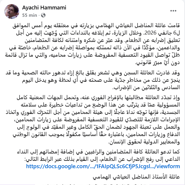 كما أكدت العائلة تدهور الحالة الصحية للعياشي الهمامي وما قد ينجرّ عن ذلك من مخاطر جدّية على صحته في أي لحظة، وذلك عقب زيارة له بسجن إيقافه أمس الثلاثاء 6 جانفي 2026.