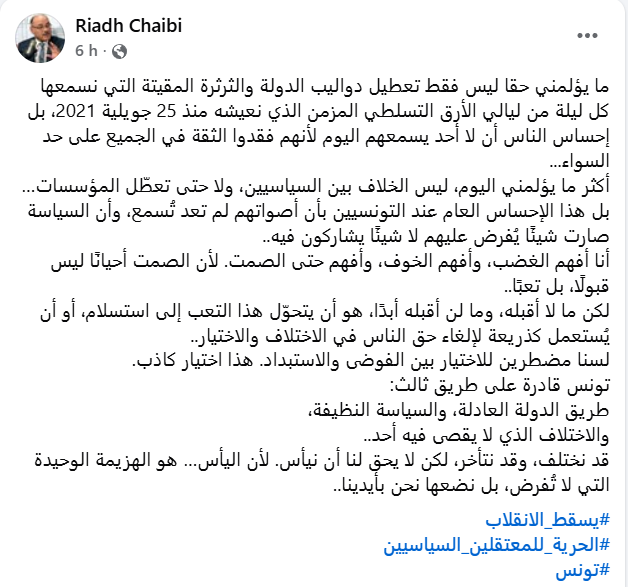 وتابع الشعيبي “لسنا مضطرين للاختيار بين الفوضى والاستبداد. هذا اختيار كاذب” معتبرا أن “تونس قادرة على طريق ثالث وهو طريق الدولة العادلة، والسياسة النظيفة، والاختلاف الذي لا يقصى فيه أحد”، وفق تعبيره.