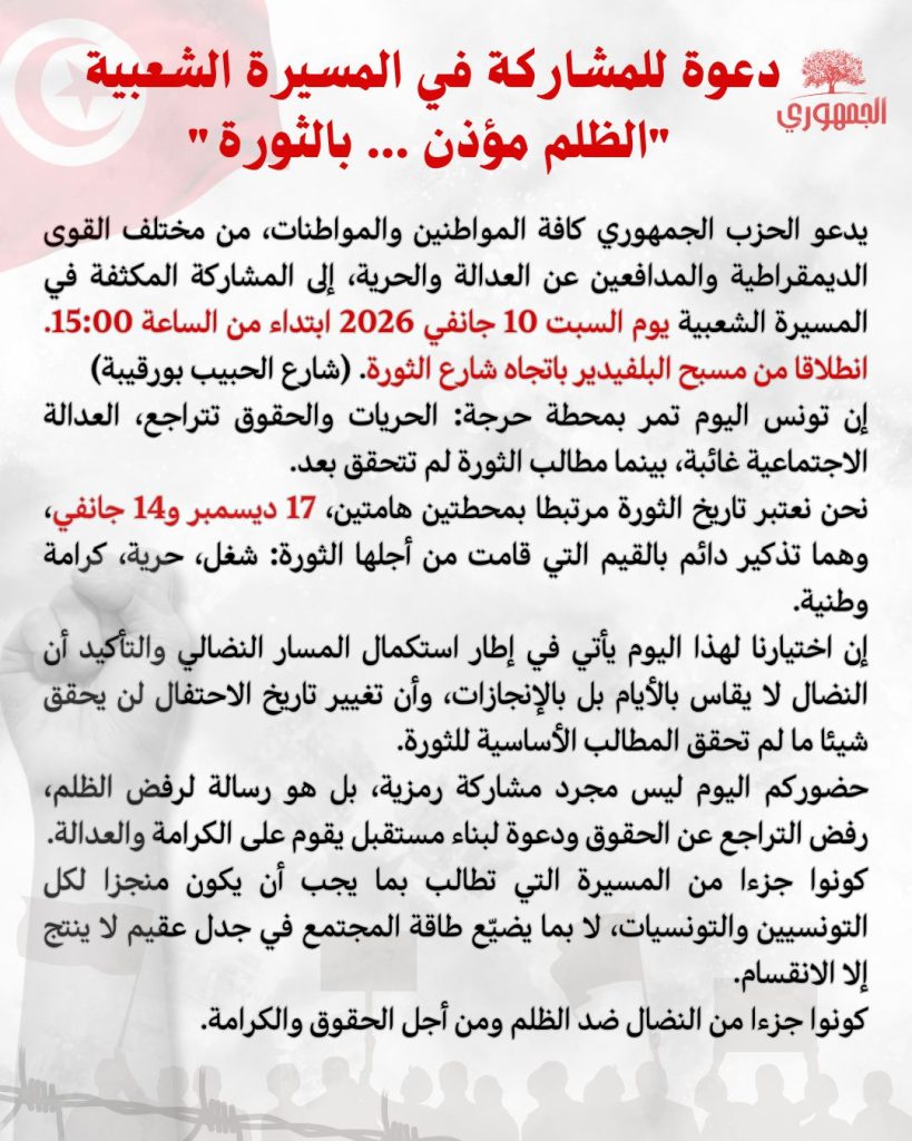 دعا، اليوم الجمعة 9 جانفي 2026، الحزب الجمهوري إلى المسيرة الاحتجاجية التي تنتظم غدا بداية من الساعة الثالثة بعد الظهر، تحت شعار "الظلم مؤذن.. بالثورة".