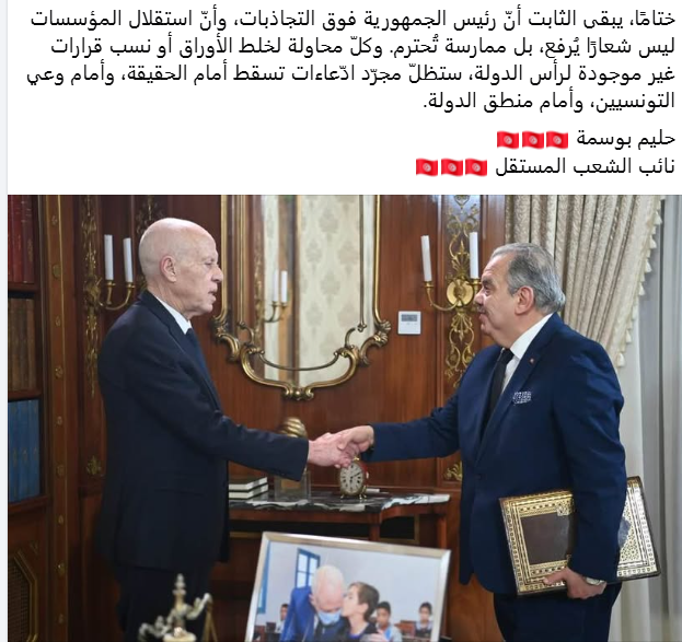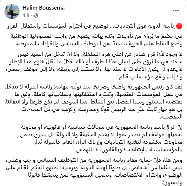 وشدد بوسمة على أن “حماية مقام رئاسة الجمهورية من التوظيف السياسي هي واجب وطني، ليس دفاعًا عن أشخاص، بل صونًا لهيبة الدولة، وترسيخًا لمنهج الحكم القائم على الوضوح، واحترام الاختصاصات، وتحميل المسؤولية لمن يتحمّلها قانونًا ودستوريًا”.