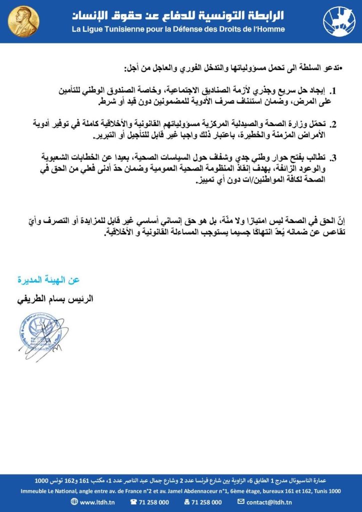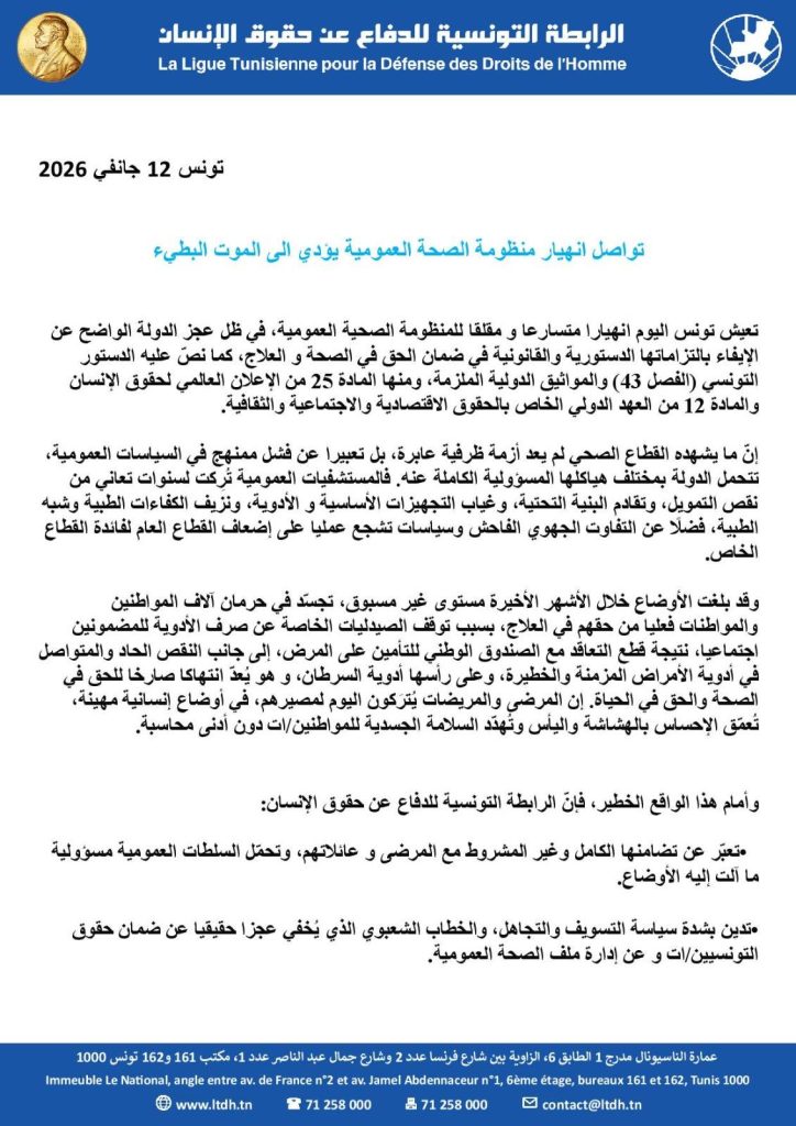 وأكدت رابطة حقوق الإنسان على أن الحق في الصحة ليس امتيازا ولا منّة، بل هو حق إنساني أساسي غير قابل للمزايدة أو التصرف وأيّ تقاعس عن ضمانه يُعدّ انتهاكًا جسيما يستوجب المساءلة القانونية و الأخلاقية، وفق بيان لها.