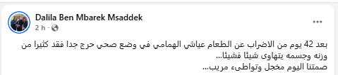 أفادت المحامية دليلة مصدق في تدوينة نشرتها على صفحتها بالفيسبوك مساء اليوم الإثنين 12 جانفي 2026 بأنه بعد 42 يوم من الاضراب عن الطعام فإن الوضع الصحي للمحامي العياشي الهمامي حرج جدا وفقد كثيرا من وزنه وجسمه يتهاوى شيئا فشيئا.
