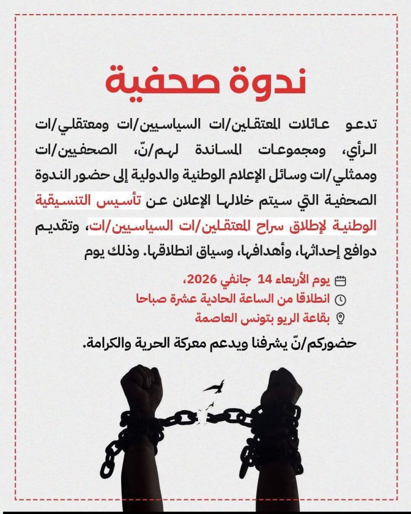 تنظم “عائلات المعتقلين السياسيين ومعتقلي الرأي” ندوة صحفية، غدا الأربعاء 14 جانفي 2026 سيتم خلالها الإعلان عن تأسيس “التنسيقية الوطنية لإطلاق سراح المعتقلين السياسيين” وتقديم دوافع إحداثها وأهدافها وسياق انطلاقها، وذلك بقاعة الريو بالعاصمة.