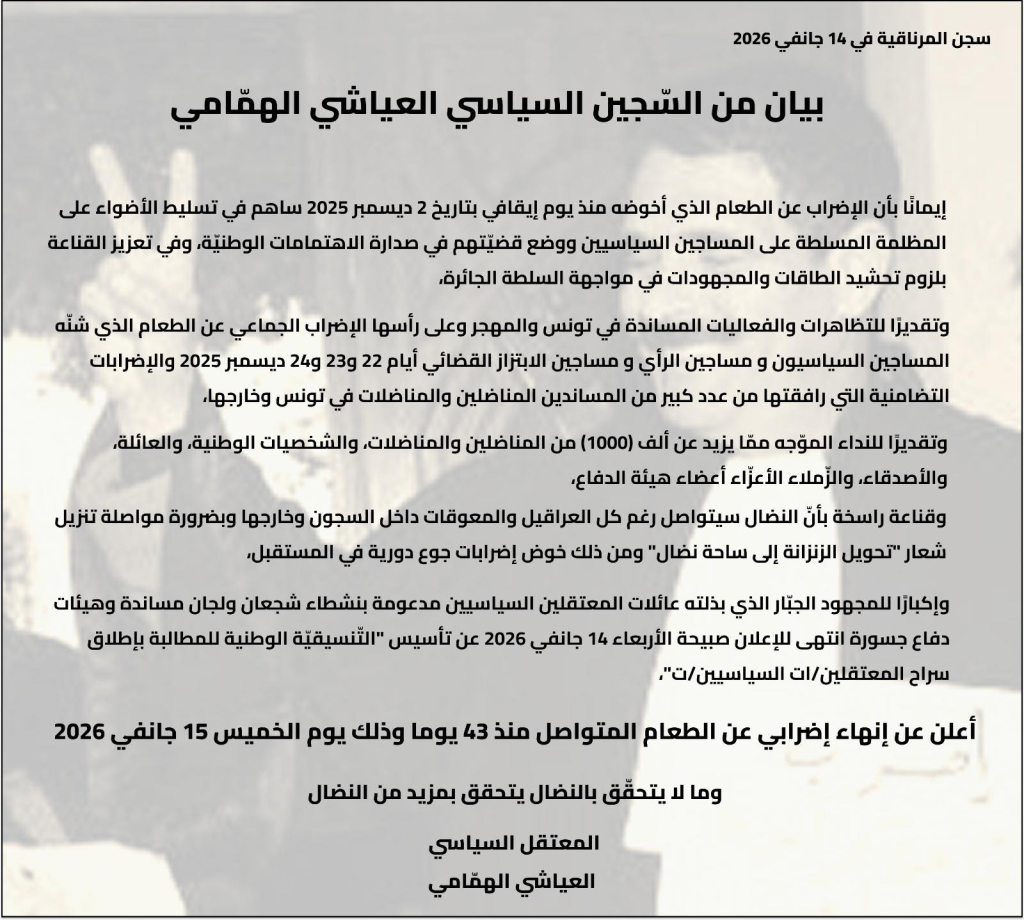 يذكر أن العياشي الهمامي قد دخل في اضراب جوع منذ تاريخ إيقافه يوم 02 ديسمبر 2025.