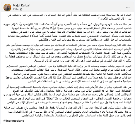 وقال الكرباعي في تدوينة نشرها على صفحته بالفيسبوك إن “هناك تحوّل لافت في تعاطي السلطات الإيطالية مع ملف الترحيل، إذ توقفت عملياً عن نشر الأرقام الرسمية المتعلقة بعمليات الترحيل القسري، وعدد التونسيين المحتجزين في مراكز الحجز والترحيل”.