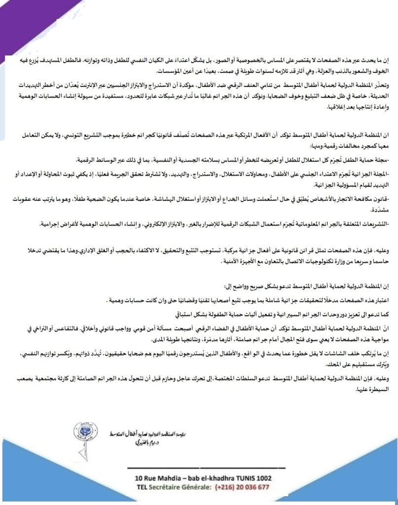 وحذّرت منظمة حماية أطفال المتوسط، في بيان، من أن الصفحات والحسابات الضالعة في هذه التجاوزات قد تخفي وراءها جرائم جسيمة تهدد سلامة الأطفال الجسدية والنفسية وكيانهم الإنساني، معربة عن قلقها البالغ وانشغالها العميق بنشاط هذه الصفحات.