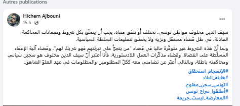 وعبر القيادي بالتيار الديمقراطي هشام العجبوني عن تضامنه مع مخلوف ومع كل المظلومين والمظلومات، وفق نص التدوينة.
