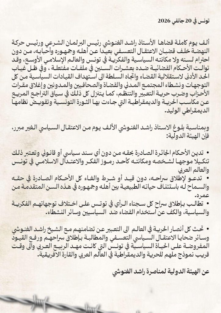 واعتبرت، في بيان بمناسبة مرور ألف يوم على إيقافه، أن ما يتعرّض له راشد الغنوشي “تنكيلا موجّها لشخصه ومكانته كأحد رموز الفكر والاعتدال الإسلامي في تونس والعالم العربي”.