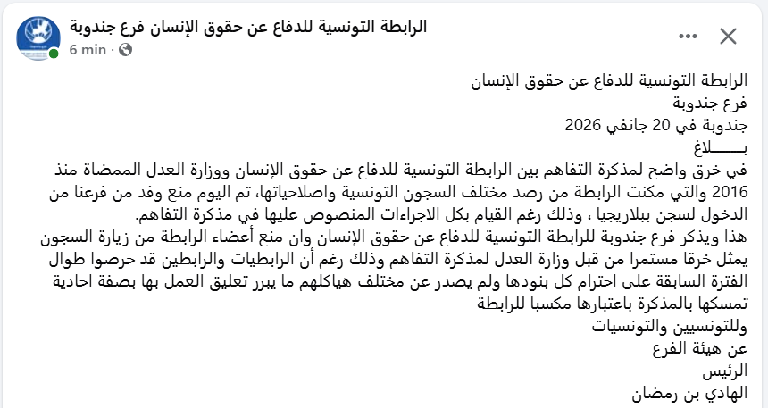وشدد فرع جندوبة للرابطة التونسية للدفاع عن حقوق الإنسان على أن منع أعضاء الرابطة من زيارة السجون يمثل خرقا مستمرا من قبل وزارة العدل لمذكرة التفاهم وذلك رغم أن الرابطيات والرابطين قد حرصوا طوال الفترة السابقة على احترام كل بنودها ولم يصدر عن مختلف هياكلهم ما يبرر تعليق العمل بها بصفة احادية”.