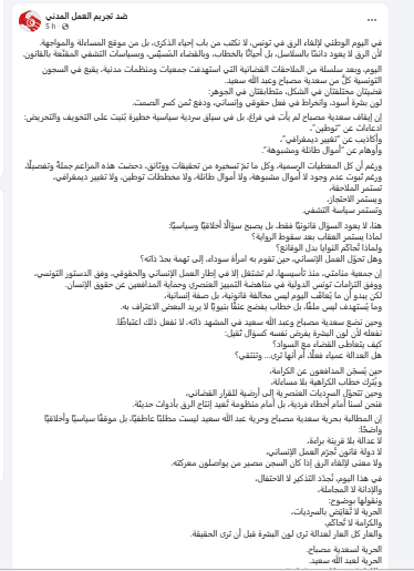 وأضافت الحملة أن المطالبة بـحرية سعدية مصباح وحرية عبد الله سعيد ليست مطلبًا عاطفيًا، بل موقفًا سياسيًا وأخلاقيًا واضحًا: لا عدالة بلا قرينة براءة، لا دولة قانون تُجرّم العمل الإنساني، ولا معنى لإلغاء الرق إذا كان السجن مصير من يواصلون معركته.