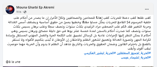 قالت منى الغربي زوجة بشير العكرمي إن إن ما يصدر من أحكام على خلفية المرسوم 54 القامع للحريات يمثّل مسارًا مقلقًا وخطيرًا يمسّ من حقوق أساسية ويضعف أسس العدالة وحرية التعبير.