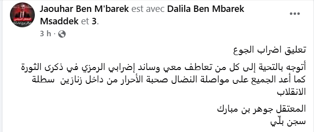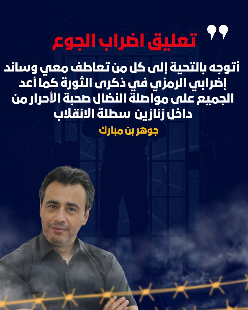 أكد السجين السياسي جوهر بن مبارك، اليوم الأحد 25 جانفي 2026، تعليق إضرابه عن الطعام الذي خاضه منذ يوم 14 جانفي الجاري في ذكرى الثورة التونسية.
