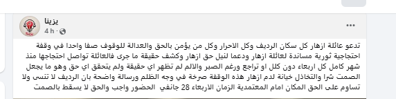 أشار الحراك إلى أن “العائلة تواصل احتجاجها منذ شهر كامل كل اربعاء دون كلل او تراجع لكن لم تظهر اي حقيقة ولم يتحقق اي حق وهو ما يجعل الصمت شرا والتخاذل خيانة لدم أزهار”.