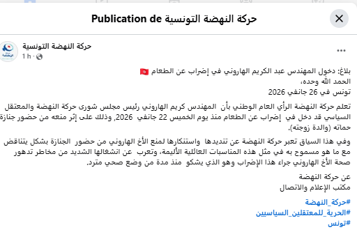 أعلنت حركة النهضة عن دخول كريم الهاروني رئيس مجلس شورى حركة النهضة في إضراب عن الطعام منذ يوم الخميس 22 جانفي 2026, وذلك على إثر منعه من حضور جنازة حماته (والدة زوجته).