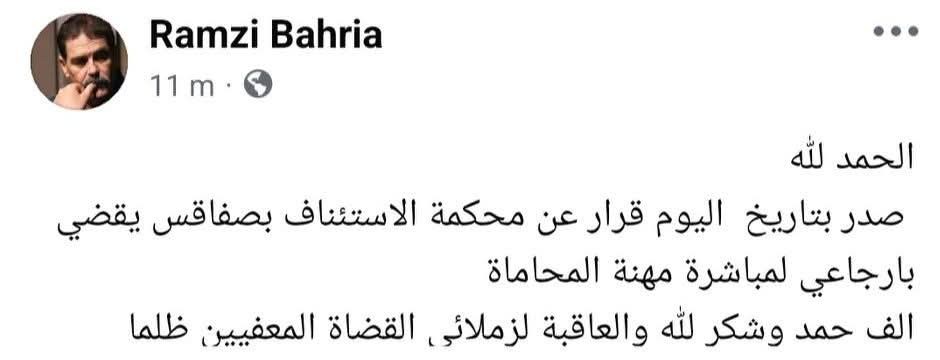 قال القاضي المعفي رمزي بحرية إن محكمة الاستئناف بصفاقس أنصفته اليوم الاثنين بإصدار قرار يقضي بإعادته إلى سلك المحاماة.