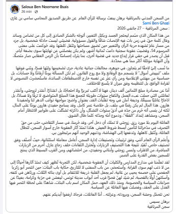 وتابع يسيس في رسالته:” العائلة اليوم بلا مورد رزق. زوجتي لا تملك أي دخل آخر، وقد حُرمنا، في مسار التقاضي، حتى من حقّ التصرف في مدّخراتنا لتأمين أبسط شروط العيش. هكذا تمتدّ آثار العقوبة خارج أسوار السجن، لتطال العائلة، وتُثقِل كاهلها، وتدفعها إلى الهشاشة، وذنبهم الوحيد أنهم مرتبطون بي”.