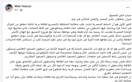 أفاد عضو تنسيقية العمل المشترك من أجل فلسطين وائل نوار بأن السلط المصرية اجابت على مطالبهم المتعلقة بالتصريح لقافلة برية اغاثية تنطلق من الجزائر في اتجاه غزة ويشارك فيها ناشطون من مختلف انحاء العالم ومتطوعون في كافة المجالات التي تحتاجها غزة.