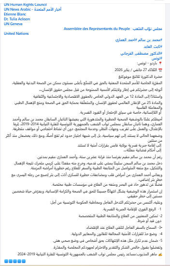 توجه النائب السابق بالبرلمان ماهر مذيوب بنداء إلى المقرّرة الخاصة للأمم المتحدة المعنية بالحق في الصحة بخصوص الوضعية الصحية للنائبين السابقين محمد بن سالم وأحمد العماري.