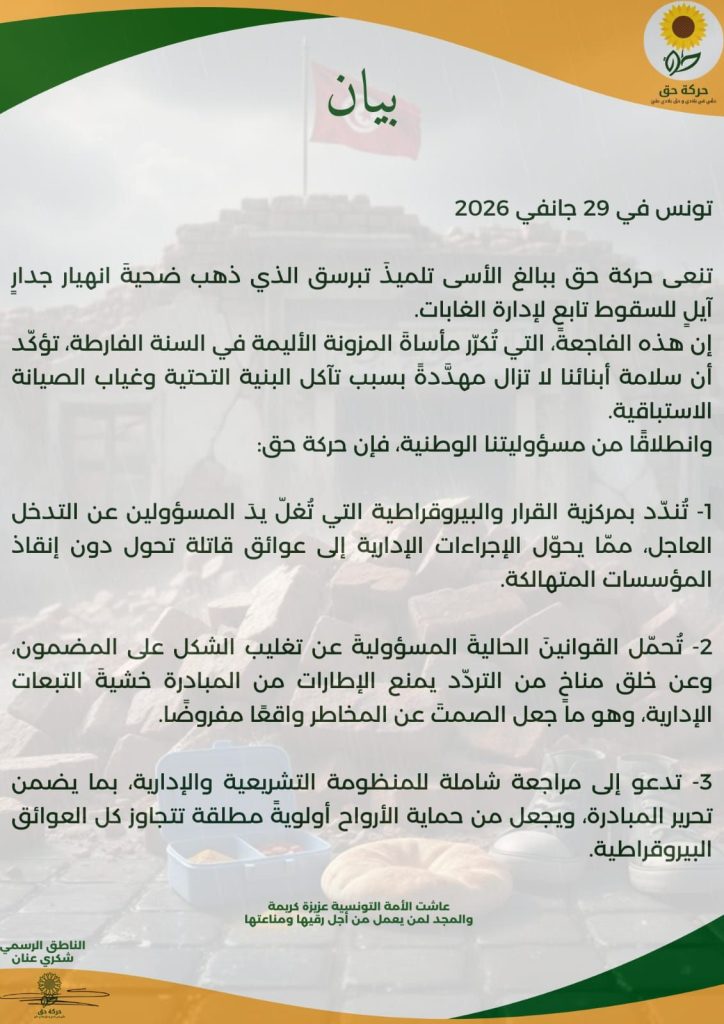 واعتبرت حركة حق في بيان لها، أن هذه الفاجعة، تُكرّر مأساةَ المزونة الأليمة في السنة الفارطة، منددة بمركزية القرار والبيروقراطية التي تُغلّ يدَ المسؤولين عن التدخل العاجل، ممّا يحوّل الإجراءات الإدارية إلى عوائق قاتلة تحول دون إنقاذ المؤسسات المتهالكة.