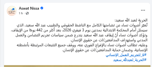 وشددت أصوات نساء على أن إيقاف عبد الله سعيد يندرج ضمن سياسات تجريم التضامن والعمل المدني واستهداف المدافعين/ات عن حقوق الإنسان.