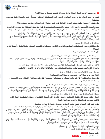 وتابع في تدوينة نشرها على صفحته بالفيسبوك: تونس لا تحتاج خطابات تُطمئنها، بل دولة تعمل، وتلك هي المعركة الحقيقية اليوم.