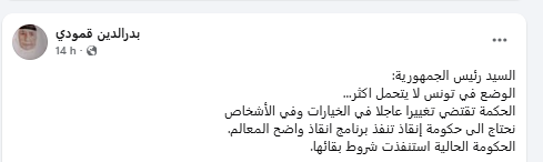 بدوره دعا النائب بدر الدين القمودي إلى تحوير حكومي قائلا إن الوضع في تونس لا يتحمل اكثر والحكمة تقتضي تغييرا عاجلا في الخيارات وفي الأشخاص.
