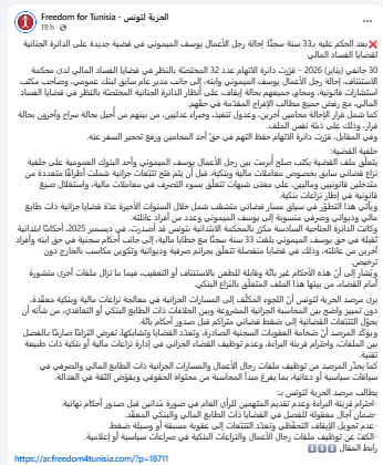 ودعا المرصد في بلاغه إلى ضمان آجال معقولة للفصل في القضايا ذات الطابع المالي والبنكي المعقّد وعدم تحويل الإيقاف التحفّظي وتعدّد التتبّعات إلى عقوبة مسبقة أو وسيلة ضغط، وذلك على خلفية إحالة رجل الأعمال يوسف الميموني في قضية جديدة على الدائرة الجنائية لقضايا الفساد المالي