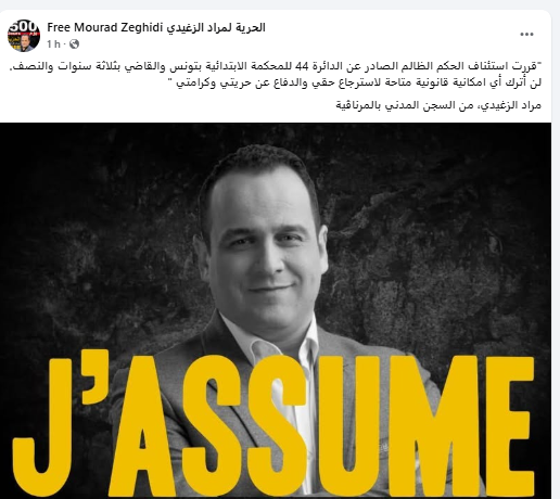 وقال الزغيدي من سجن المرناقية إنه” لن يترك أي امكانية قانونية متاحة لاسترجاع حقه والدفاع عن حريته وكرامته”.