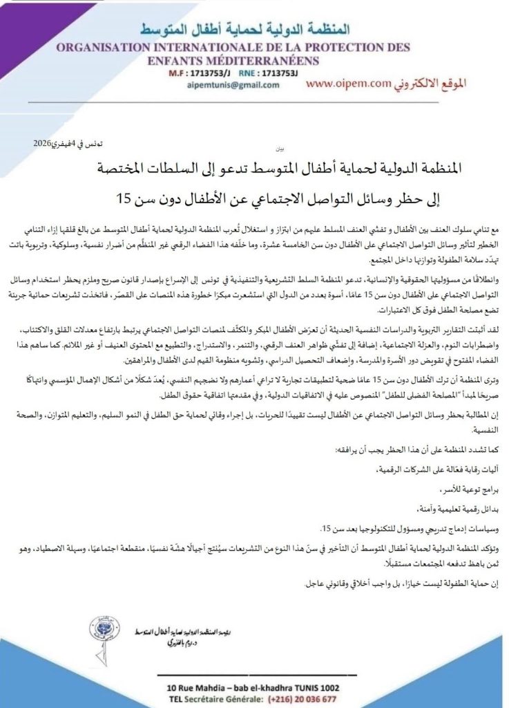 وأشارت المنظمة الدولية لحماية أطفال المتوسط إلى أن التأخير في سنّ هذا النوع من التشريعات سينتج أجيالا هشة نفسيا، منقطعة اجتماعيا، وسهلة الاصطياد، وهو ثمن باهظ ستدفعه المجتمعات مستقبلا، وفق نص البيان.