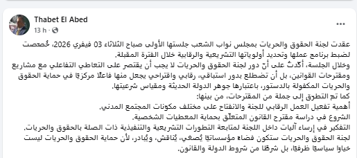 قال رئيس لجنة الحقوق والحريات بالبرلمان ثابت العابد إنّ “وخلال الجلسة، أكّدتُ على أنّ دور لجنة الحقوق والحريات لا يجب أن يقتصر على التعاطي التفاعلي مع مشاريع ومقترحات القوانين، بل أن تضطلع بدور استباقي، رقابي واقتراحي يجعل منها فاعلًا مركزيًا في حماية الحقوق والحريات المكفولة بالدستور، باعتبارها جوهر الدولة الحديثة ومقياس شرعيتها”.
