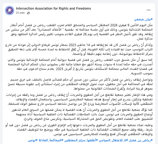 يذكر أنه قد مثل اليوم الإثنين 9 فيفري 2026 المعتقل السياسي والمنسّق العام لحزب القطب رياض بن فضل أمام أنظار المحكمة الابتدائية بتونس، وذلك في أول جلسة محاكمة له بقضية ” الأملاك المصادرة” بعد أكثر من سنتين من إيقافه.