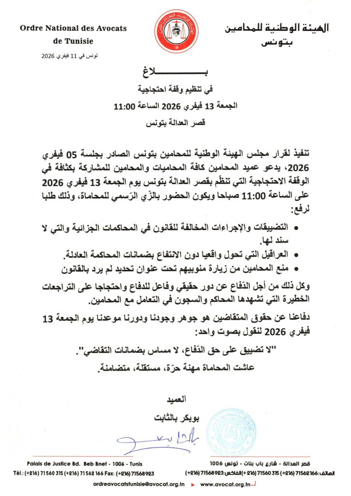 ينفذ المحامون اليوم الجمعة 13 فيفري 2026، وقفة احتجاجية بقصر العدالة بتونس، وذلك تنفيذا لقرار مجلس الهيئة الوطنية للمحامين بتونس الصادر بجلسة 05 فيفري 2026.