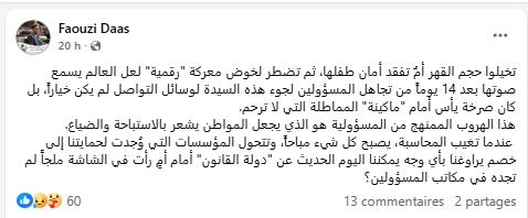 وتابع دعاس في تدوينة نشرها على صفحته بالفيسبوك: “تخيلوا حجم القهر أمٌ تفقد أمان طفلها، ثم تضطر لخوض معركة “رقمية” لعل العالم يسمع صوتها بعد 14 يوماً من تجاهل المسؤولين لجوء هذه السيدة لوسائل التواصل لم يكن خياراً، بل كان صرخة يأس أمام “ماكينة” المماطلة التي لا ترحم”.