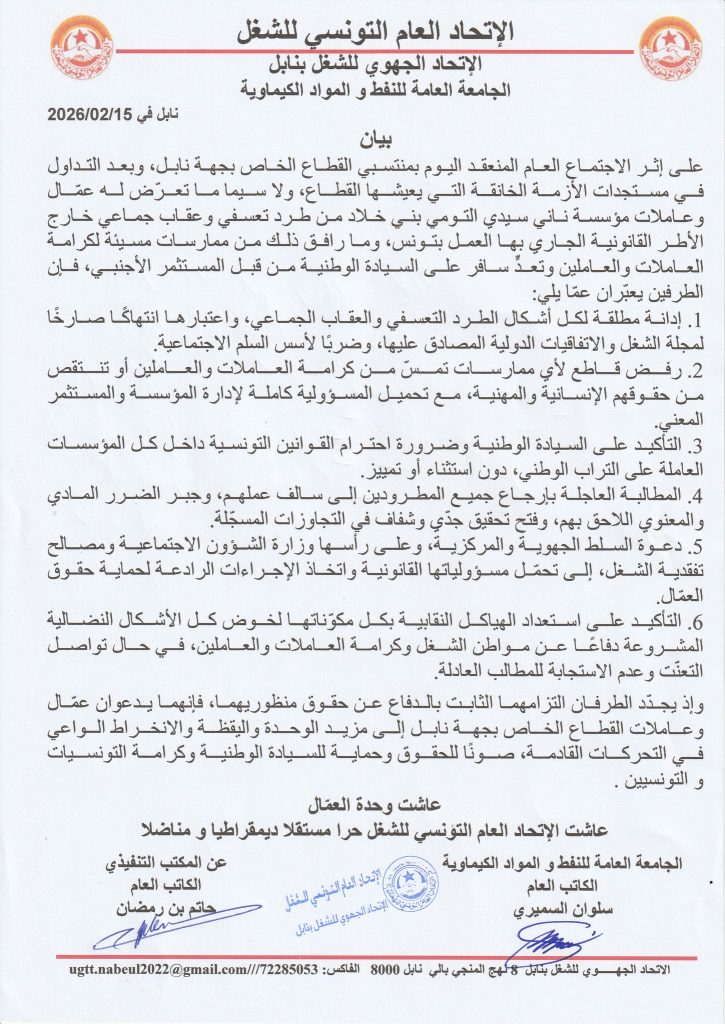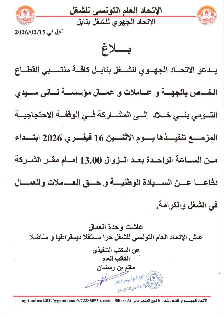 من جهته دعا الاتحاد الجهوي للشغل بنابل كافة منتسبي القطاع الخاص بالجهة وعاملات وعمال مصتع “ناني سيدي التومي بني خلاد” إلى المشاركة في الوقفة الاحتجاجية المزمع تنفيذها يوم الاثنين 16 فيفري 2026 ابتداء من الساعة الواحدة بعد الزوال 13.00 أمام مقر الشركة دفاعا عن السيادة الوطنية وحق العاملات والعمال في الشغل والكرامة.