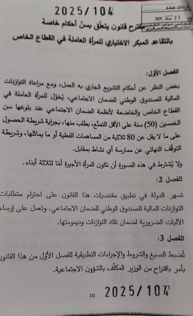 وينص المقترح على إقرار آلية للتقاعد المبكر لفئة النساء العاملات في القطاع الخاص، بداية من سن 50 عاما، بصفة اختيارية شريطة استكمال 80 ثلاثية، أي ما يعادل 20 سنة من المساهمات الفعلية في الصندوق الوطني للضمان الاجتماعي، مع التنصيص على التوقّف النهائي عن النشاط المهني بمقابل.