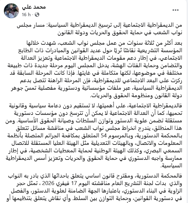 واعتبر محمد علي في تدوينة نشرها عبر حسابه الخاص على الفايسبوك، بأن “المرحلة الراهنة تتصل بدعم الديمقراطية السياسية، عبر ملفات مؤسساتية ودستورية مفصلية تمسّ جوهر دولة القانون ومنظومة الحقوق والحريات” مشددا على أن “الديمقراطية الاجتماعية، لا تستقيم دون دعامة سياسية وقانونية تحميها، كما أن العدالة الاجتماعية لا يمكن أن تترسخ دون مؤسسات دستورية مستقلة تضمن علوية الدستور وتوازن السلطات وصيانة الحقوق الأساسية”.
