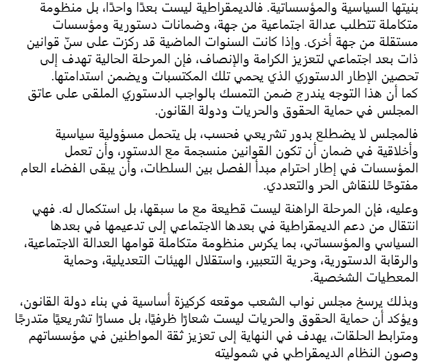 وأضاف محمد أن انتقال مجلس نواب الشعب إلى مناقشة هذه الملفات يعكس تطورًا طبيعيًا في مسار العمل البرلماني، من معالجة الأبعاد الاجتماعية للديمقراطية إلى ترسيخ بنيتها السياسية والمؤسساتية، مشددا على أن “الديمقراطية ليست بعدًا واحدًا، بل منظومة متكاملة تتطلب عدالة اجتماعية من جهة، وضمانات دستورية ومؤسسات مستقلة من جهة أخرى.”.