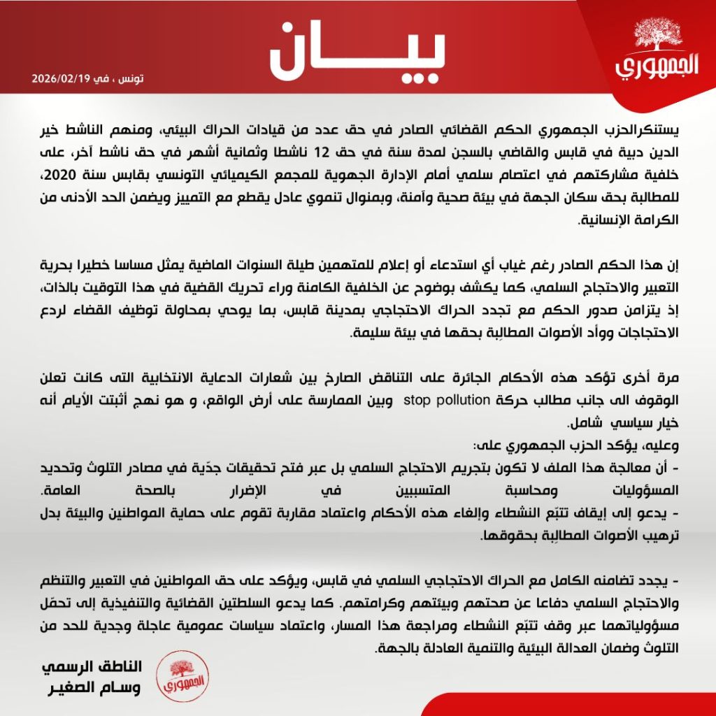 وقال الحزب إن “هذا الحكم الصادر رغم غياب أي استدعاء أو إعلام للمتهمين طيلة السنوات الماضية يمثل مساسا خطيرا بحرية التعبير والاحتجاج السلمي، كما يكشف بوضوح عن الخلفية الكامنة وراء تحريك القضية في هذا التوقيت بالذات، إذ يتزامن صدور الحكم مع تجدد الحراك الاحتجاجي بمدينة قابس، بما يوحي بمحاولة توظيف القضاء لردع الاحتجاجات ووأد الأصوات المطالِبة بحقها في بيئة سليمة، وفق بيان للحزب.